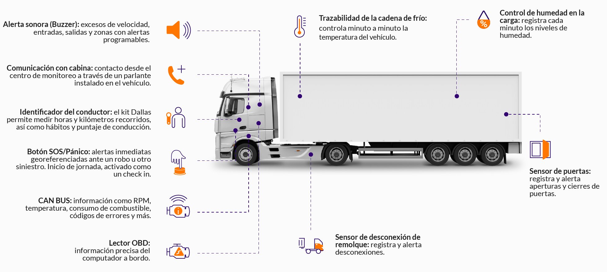 Evita averías, accidentes y malos ratos. Protege tus vehículos, sus conductores y la seguridad total de toda tu operación y tu empresa, gracias a tecnología de última generación que se anticipa a todo tipo de eventos en la vía.